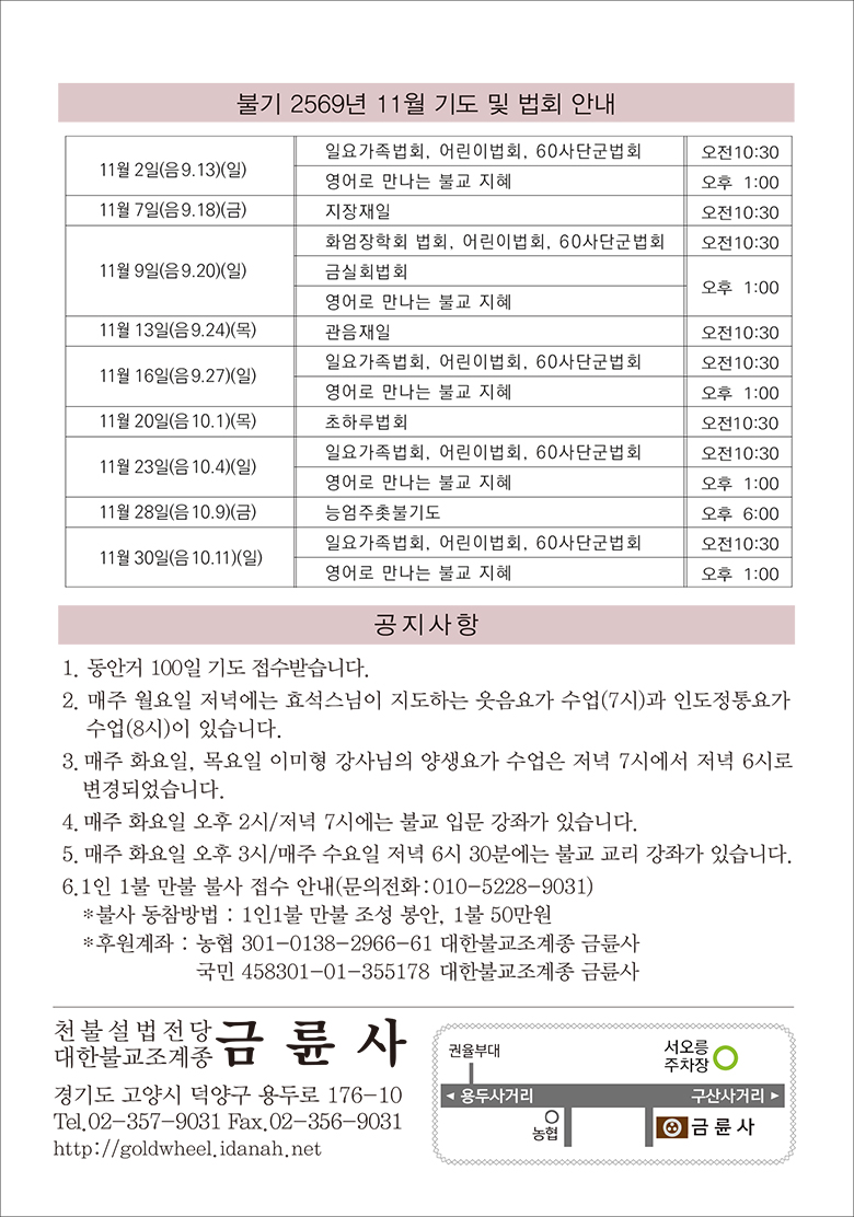 대한불교조계종 고양 금륜사경기 고양시 덕양구 용두로 176-10 (우. 10548)TEL. 02-357-9031